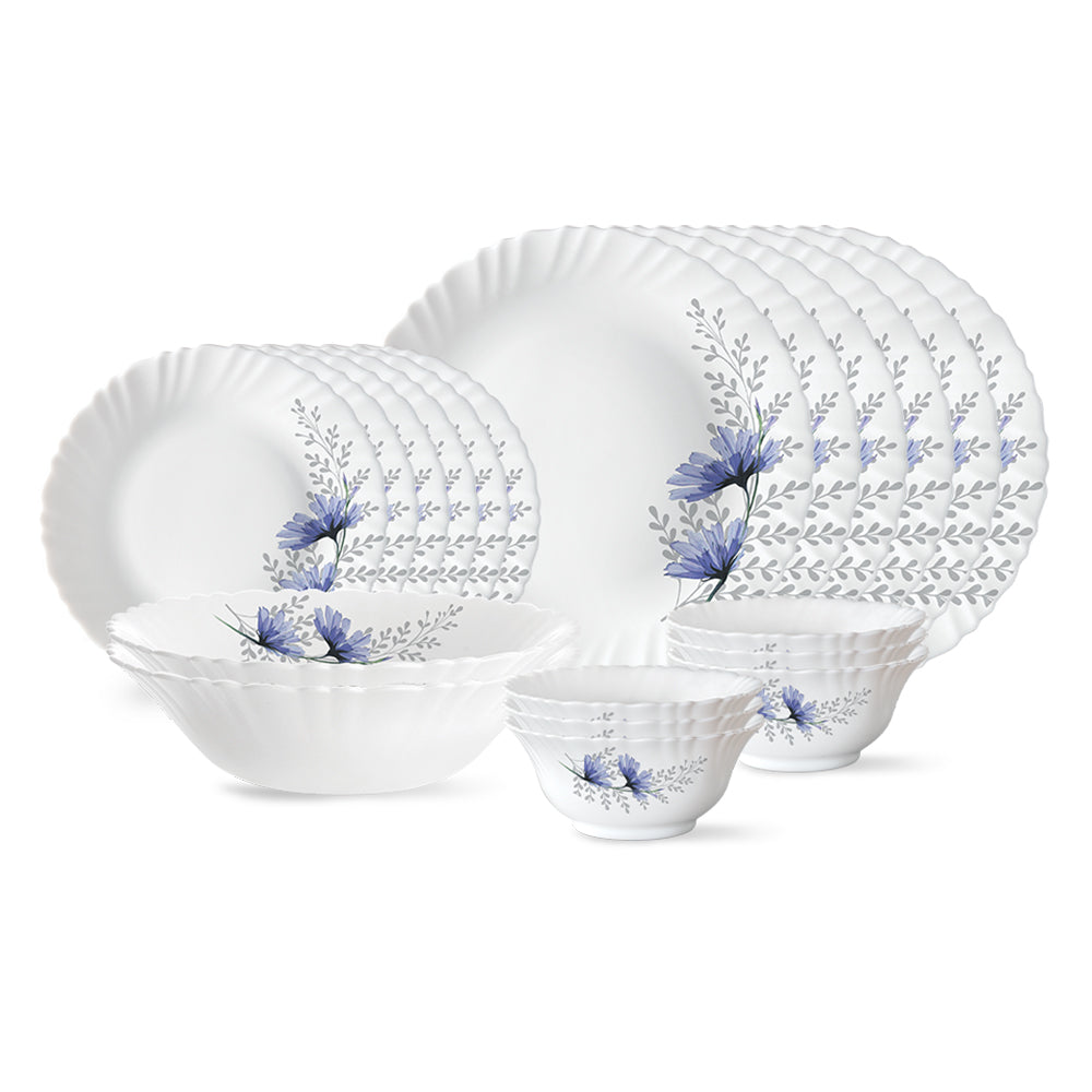 For the love of minimalism and a slight touch of winter vibe, this dinner set is designed keeping in mind the people who prefer both simplicity and creativity. It is a 9-piece combo in our silk series that includes plates, bowls and a serving bowl. You can also choose other capacities for this set, which comes in 15, 23, and 27 pieces. The glass is 100% vegetarian, completely free of bone ash, unlike bone china, which also has a higher dinner set price. The fluted rim, the eye-catching tree pattern and its extra lightweight feature give this dinner set a truly fabulous look. While lightweight, it is durable enough to be used for daily meals or in the dishwasher and microwave.