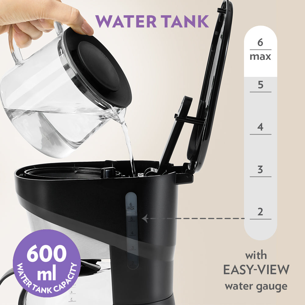 • Visible Water Tank: The clear window on the 600ml water tank makes it simple to measure and fill for the ideal coffee strength.