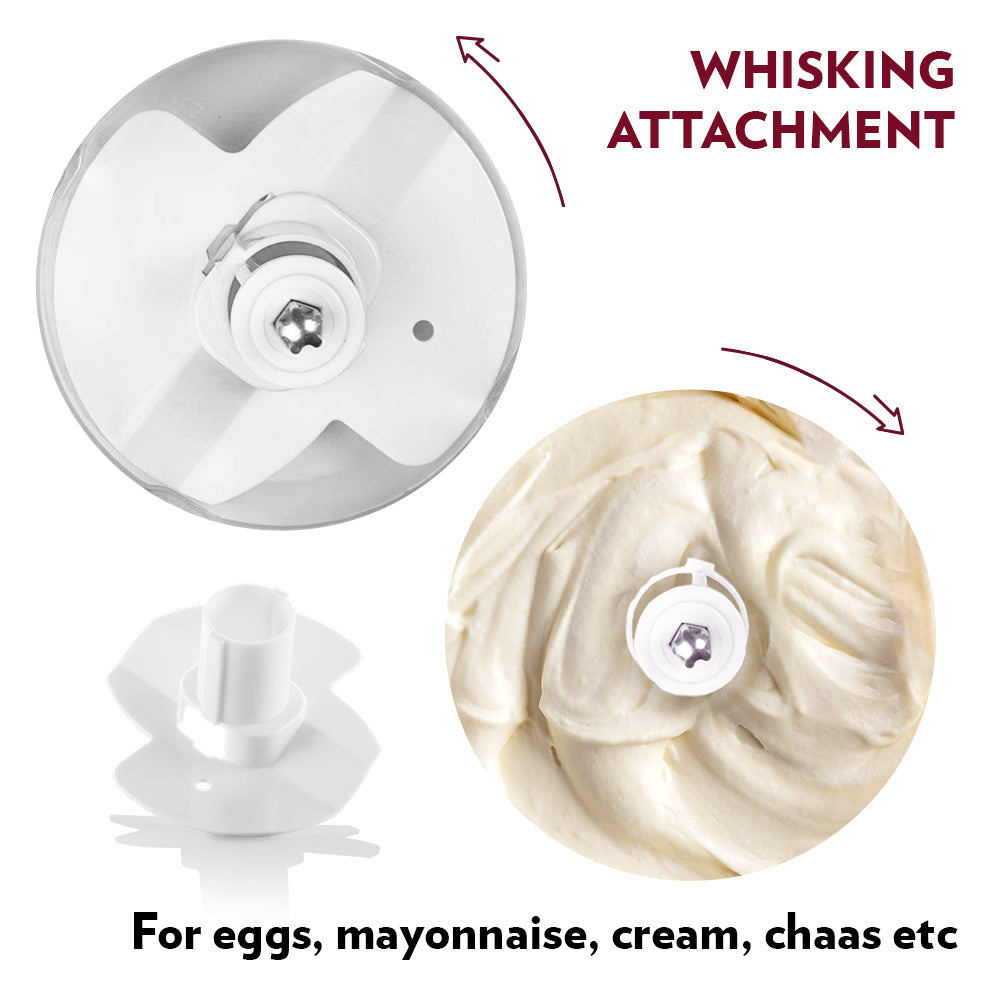 - Dual blades & whisk attachment for versatile prep