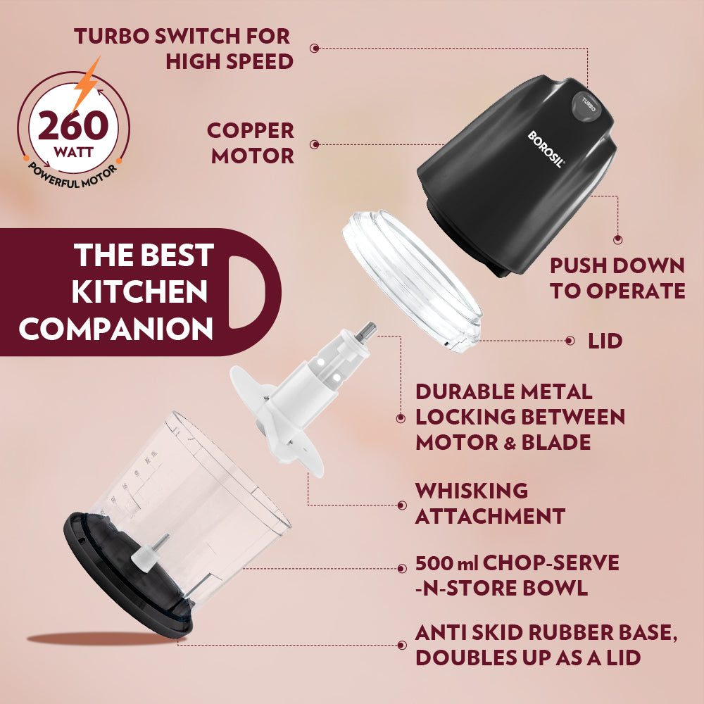 Chopping veggies shouldn't feel like a task. The Borosil Chef Delite Chopper is your everyday kitchen ally—quiet, compact, and quick. Whether you're prepping onions for tadka, making fresh dips, or blending chaas on a hot afternoon, this dual-speed chopper handles it all in seconds. With a powerful 260W copper motor and easy push-button operation, your daily food prep becomes faster, neater, and a whole lot simpler.
