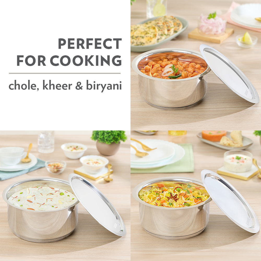 - Energy efficient tri-ply induction compatible impact bonded bottom for faster and even cooking