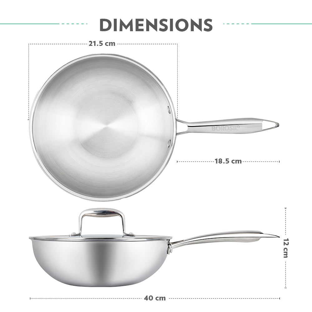 Borosil Cookfresh SS Tri-ply Wok with Lid, 1.75L/20cm