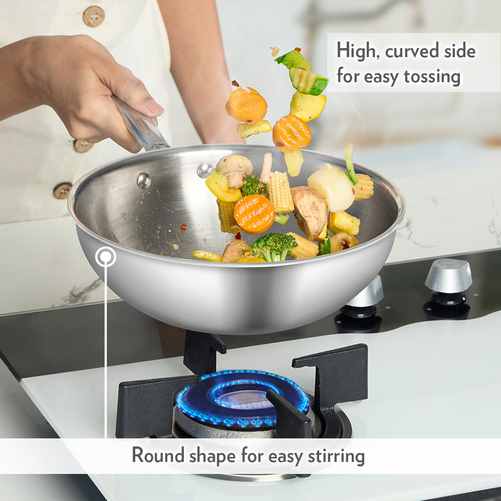Meet our Stainless Steel Tri-ply Wok with Lid – your kitchen's versatile ally! This wok redefines easy, healthy cooking. Its tri-ply design guarantees even heat distribution, letting you cook with less oil and more flavour.Its tri-ply construction guarantees even heat distribution, making it ideal for classic stir-fries, savory noodle dishes, and much more. Designed for durability, easy maintenance, and compatibility with all stove types, it's the perfect choice for Asian cooking . Elevate your kitchen experience today!