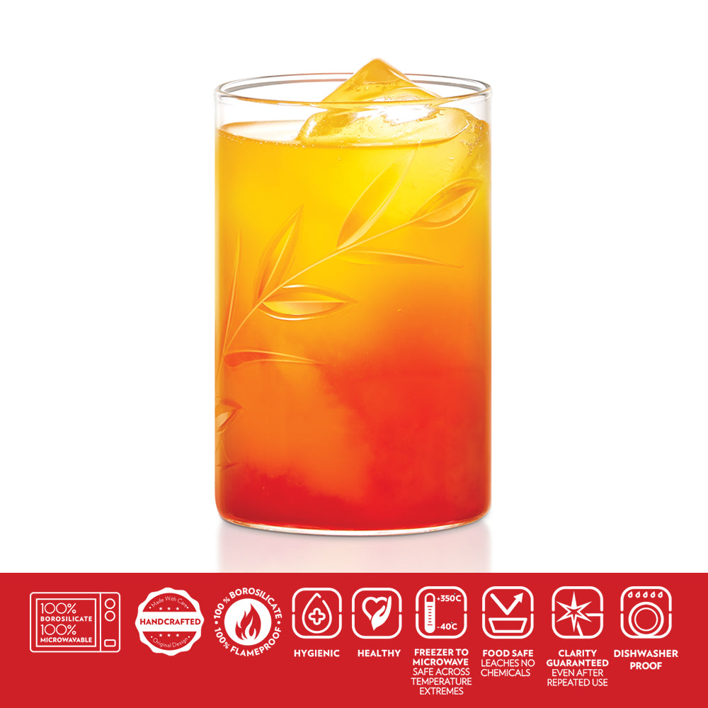The leaf etchings creeping around the body of the glass add a contemporary twist to a classic design. Microwave and fridge safe, these borosilicate glasses are scratch resistant and are great for both everyday and special ocassions.