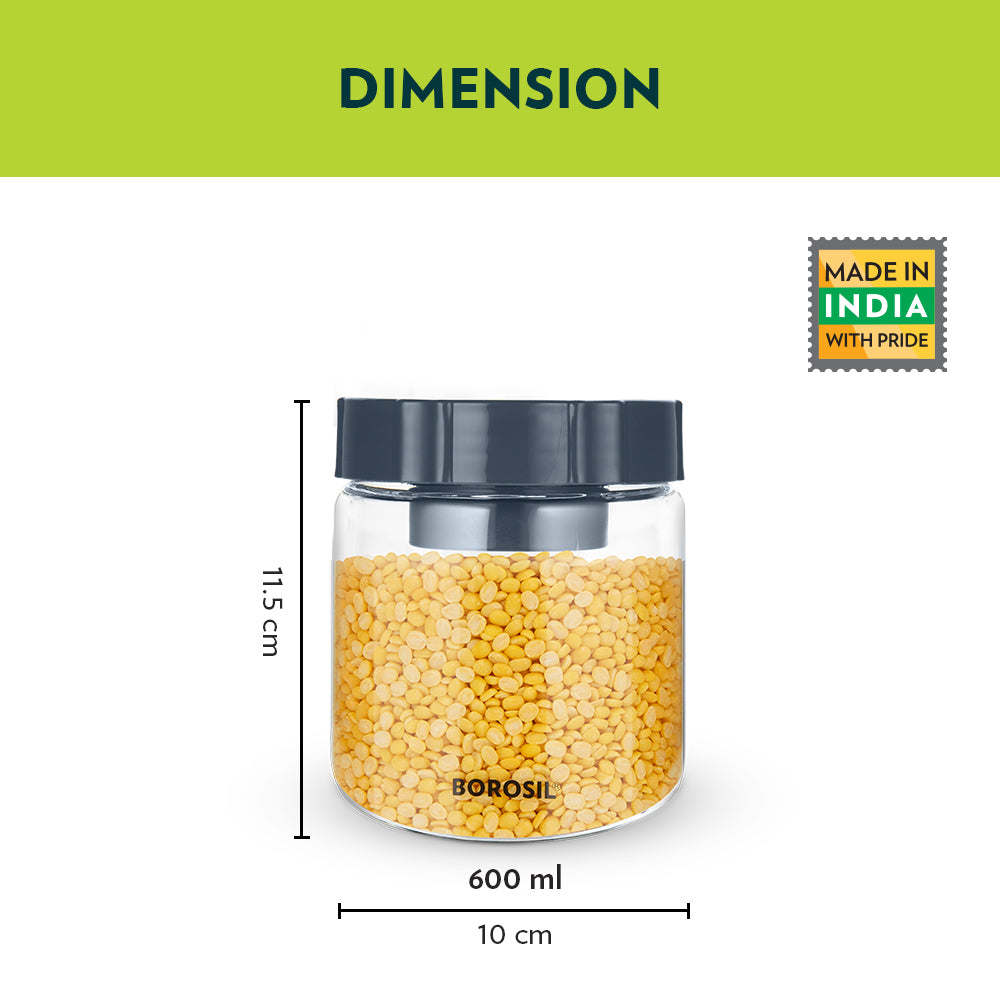 Borosil Endura Easyscoop Airtight Glass Jar with PP Lid Gray , 600 Ml