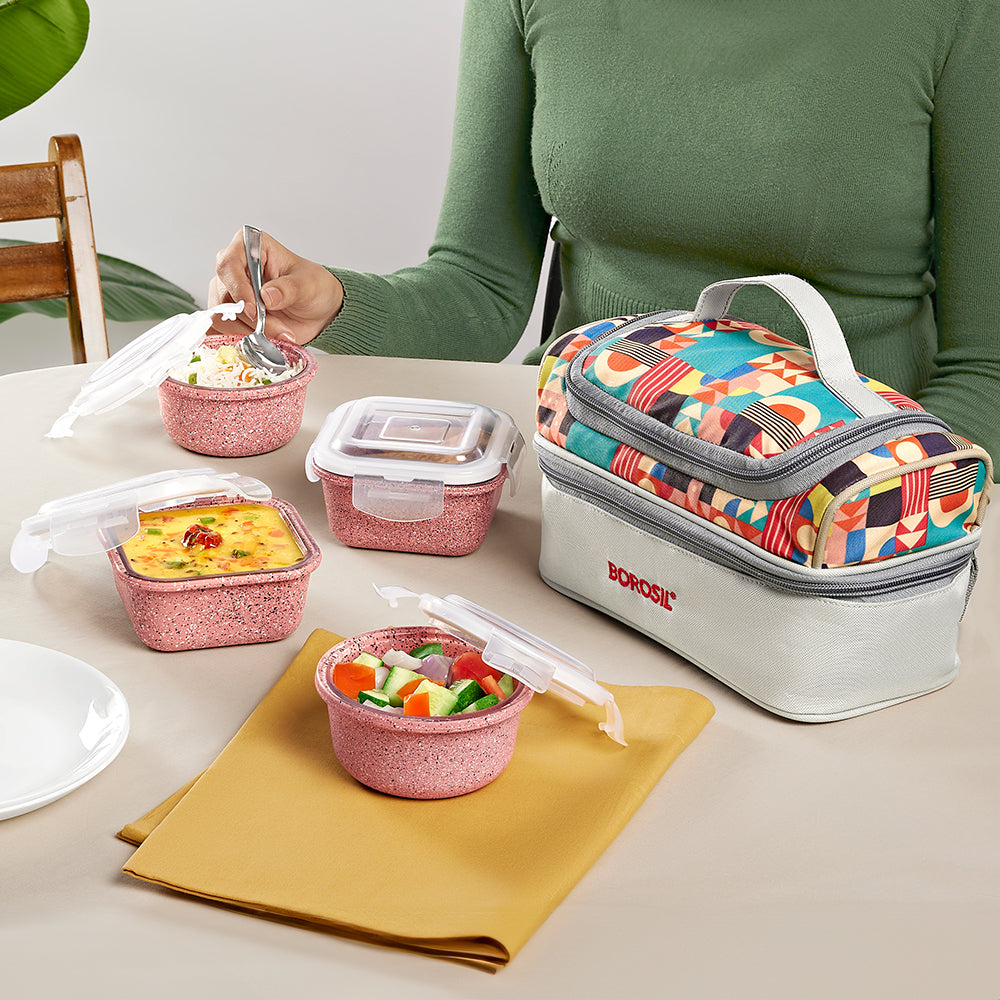 Borosil Kube Pink Universal Glass Lunchbox 320 ml x 2 + 240 ml x 2