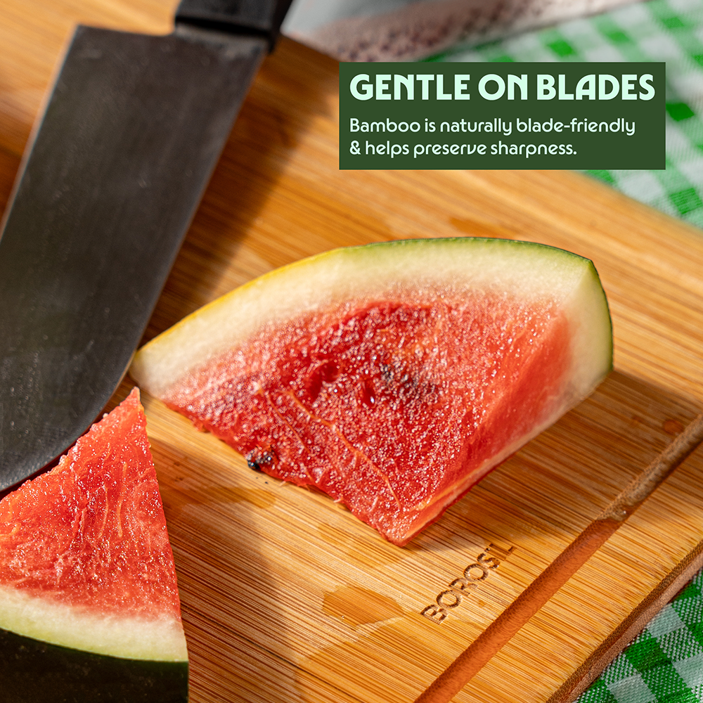 • Knife-friendly bamboo surface helps retain blade sharpness