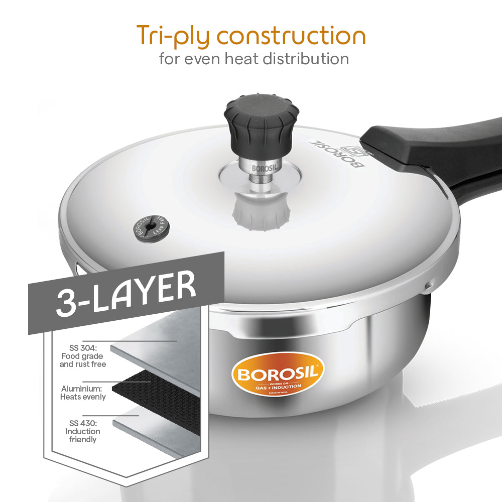 - Tri-ply Body - Designed for efficient & nutritious cooking, the Borosil Outer Lid Tri-ply pressure cooker has three different layers of metal bonded together - food grade 18/8 stainless steel & SS - 430 magnetic stainless steel and a layer of aluminium in the middle right throughout the body of cooker for even heat distribution.