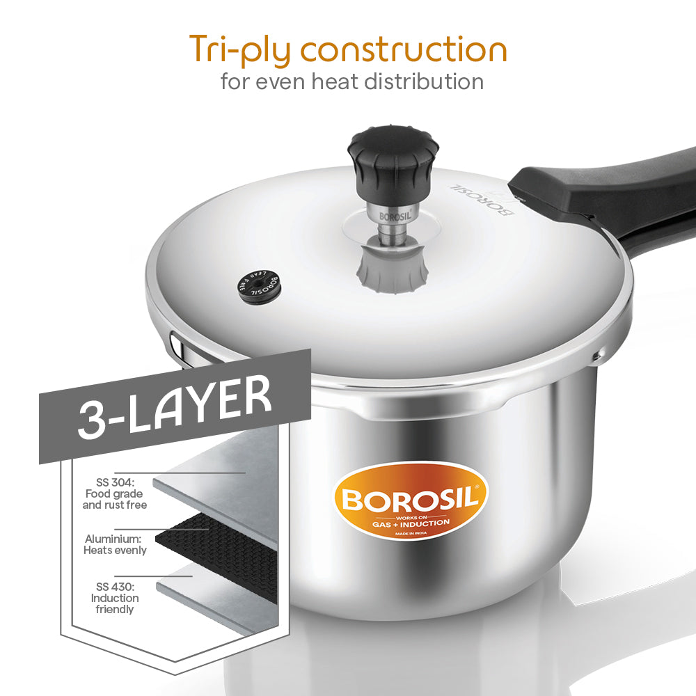 - Tri-ply Body - Designed for efficient & nutritious cooking, the Borosil Outer Lid Tri-ply pressure cooker has three different layers of metal bonded together - food grade 18/8 stainless steel & SS - 430 magnetic stainless steel and a layer of aluminium in the middle right throughout the body of cooker for even heat distribution.