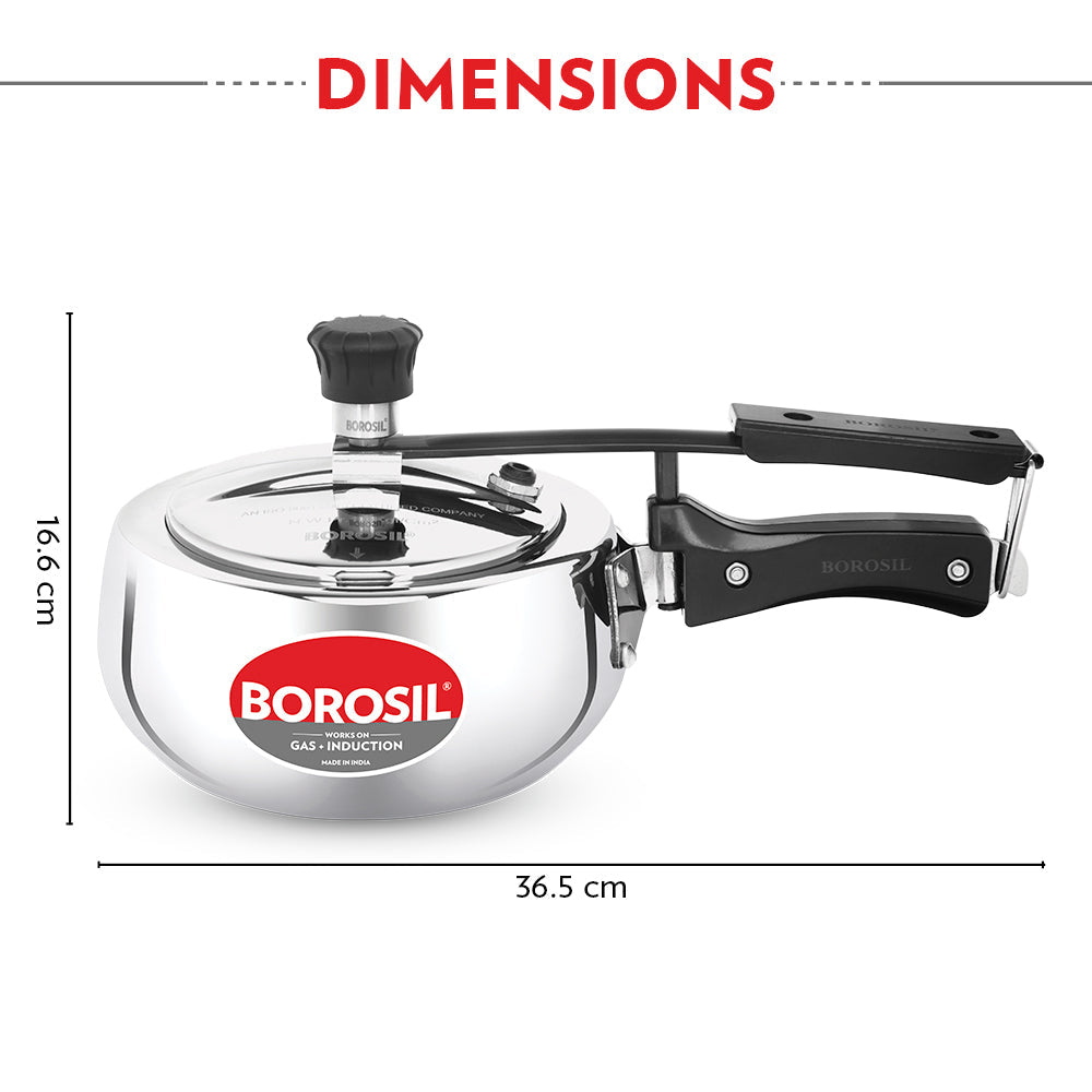 Borosil's range of Pronto stainless steel pressure cookers have been designed to provide you with the best, safest and most efficient cooking experience. The unique extra thick base transfers heat faster to speed up your cooking and save fuel cost. The food grade SS304 body ensures that your cooker will never corrode or pit. The stay cool silicone handles are designed for easy handling and convenience, and you can be rest assured that we have best in class safety features available in Borosil Pronto stainless steel pressure cookers. Built with Borosil quality standards, this pressure cooker is one purchase you will be happy you made!