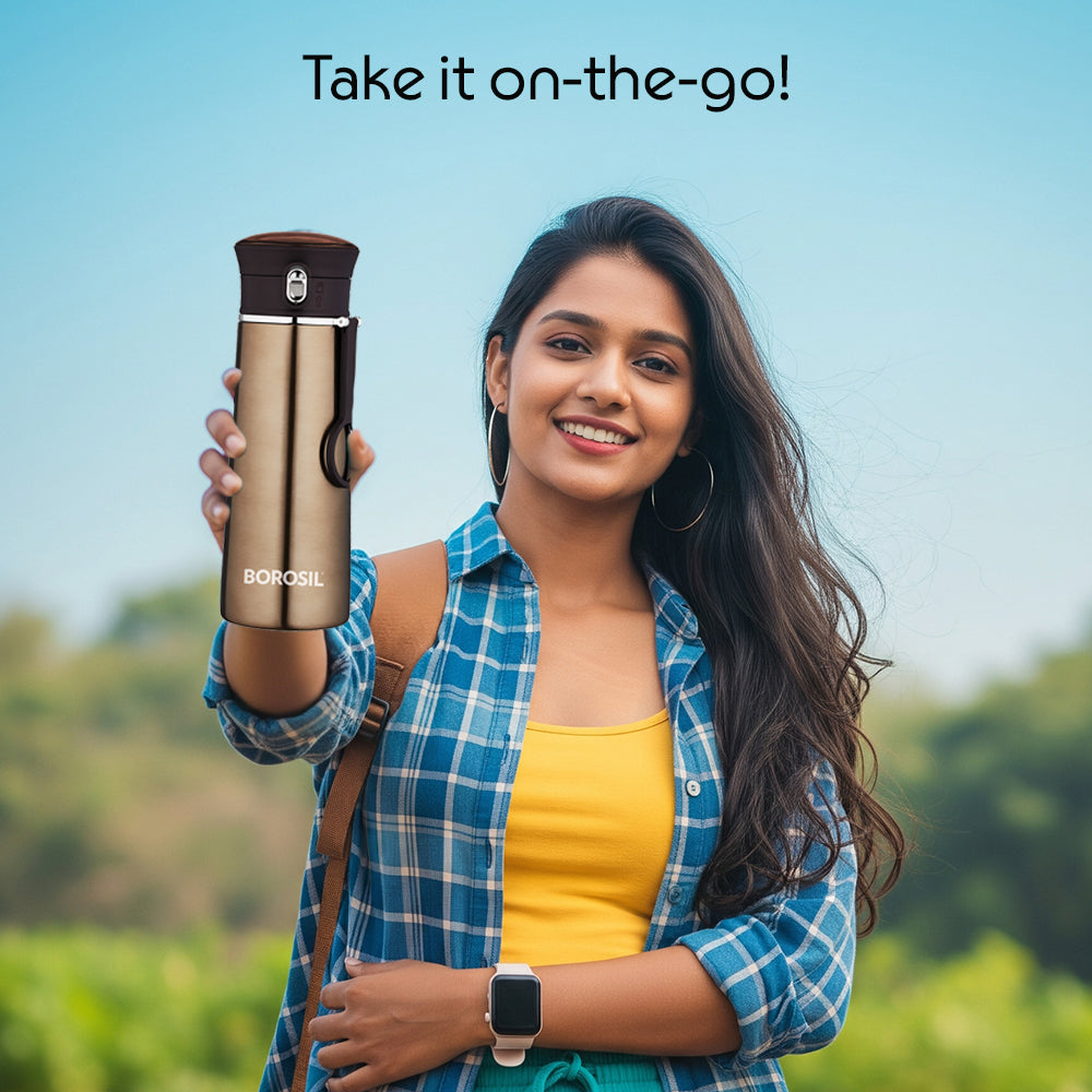 Now make carrying water with you is an easy and convenient task with the Borosil Travelease stainless steel bottles, they are perfect to fit in the pocket of your bag and also storing in your fridge making it look trendy and tidy. This leak proof, sipper bottle is your companion for all your adventures