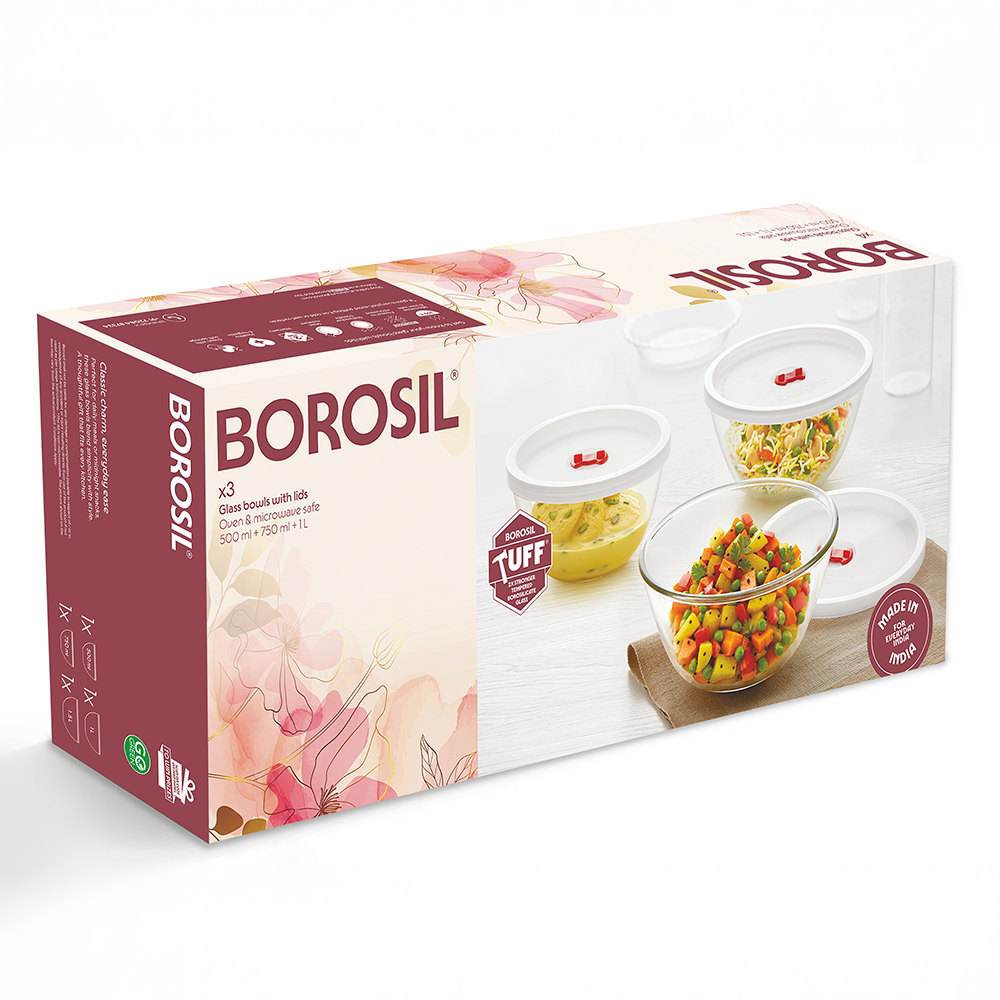 Borosil Tuff-Glass Everyday Mixing & Serving Bowl Set 500 ml x 750 ml x 1 L