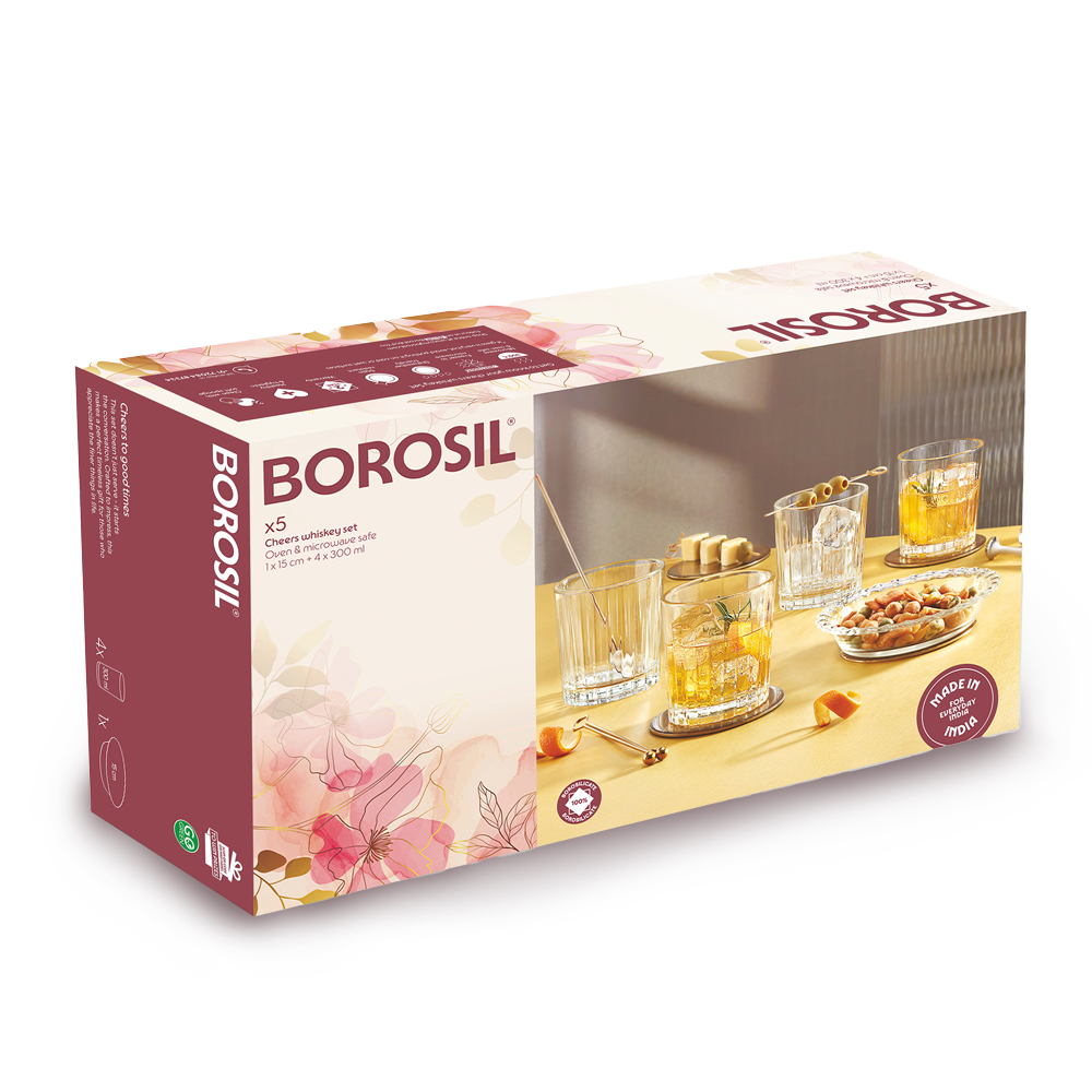 Looking to set up a mini bar at home? Need a gift for a house warming or a celebration? You're on the right page! Our glass bar set or drinking set is truly a class apart. It comes with four whiskey glasses and a designer plates - all made of premium borosilicate glass.