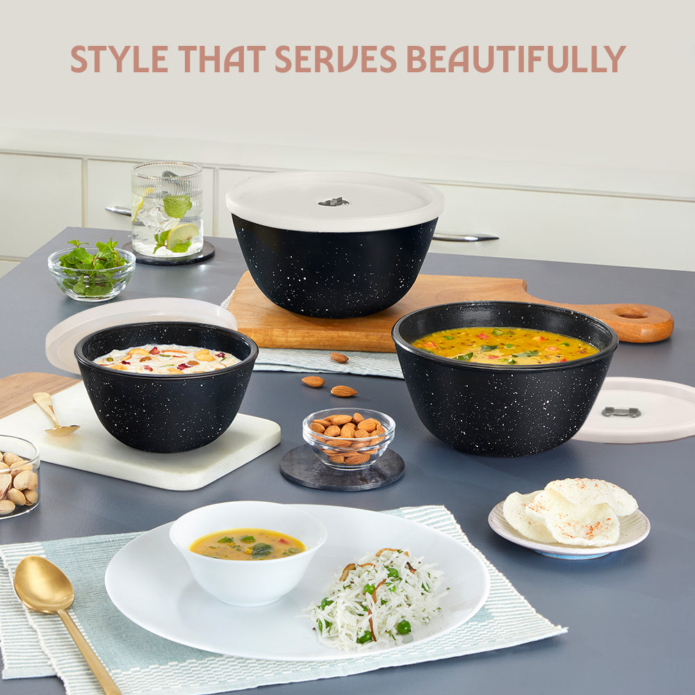 From prepping salads to serving sabzi, these bowls are designed to look as good as they serve. Available in elegant pink, black, blue, and sky blue — they add a soft pop of colour to your kitchen and charm to your table, whether you're cooking for family or entertaining guests.