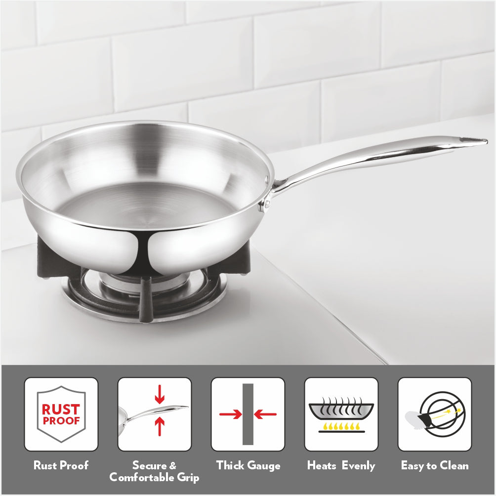 The Borosil Cookfresh cookware, with the body made of tri-ply, is a high-quality stainless steel frypan that will easily become your favorite to use for everyday cooking. The stainless steel cooking surface does not discolor, react with food or alter flavors. The tri-ply body heats quickly and allows heat to be evenly distributed providing you with a smooth and flawless cooking experience.