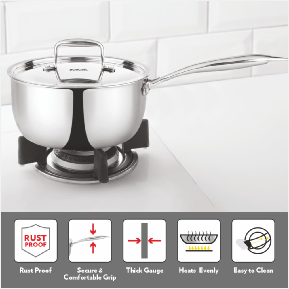 The Borosil Cookfresh cookware, with the body made of tri-ply, is a high-quality stainless steel saucepan that will easily become your favorite to use for everyday cooking. The stainless steel cooking surface does not discolor, react with food or alter flavors. The tri-ply body heats quickly and allows heat to be evenly distributed providing you with a smooth and flawless cooking experience.
