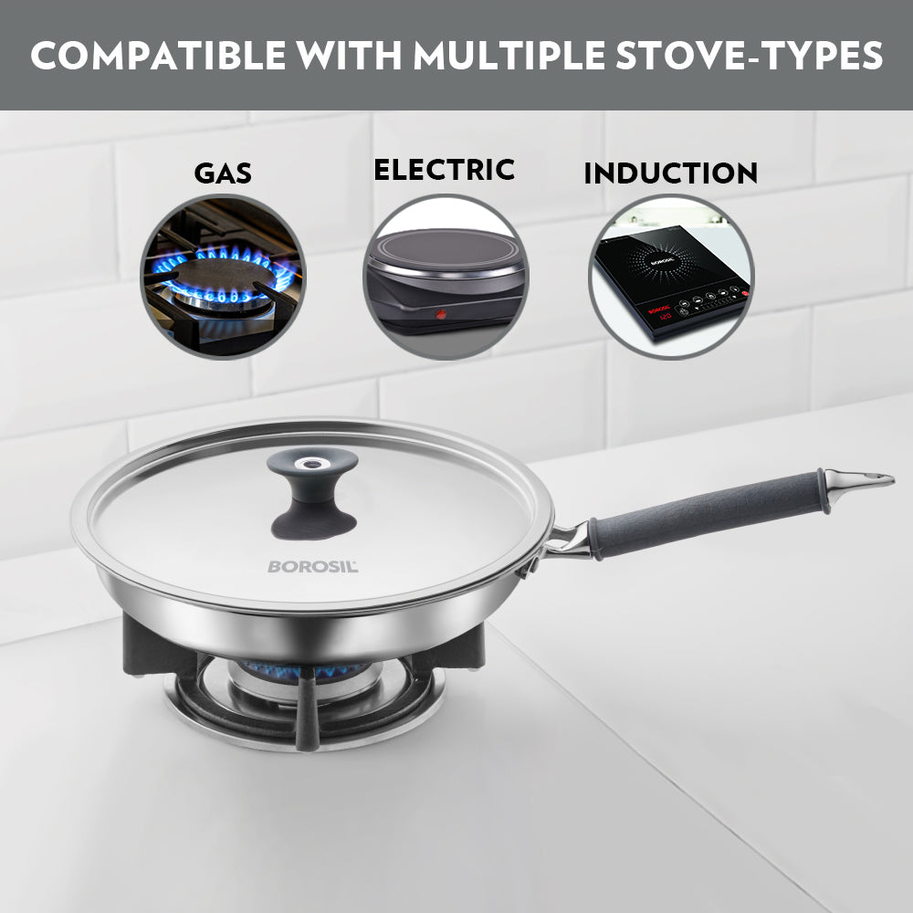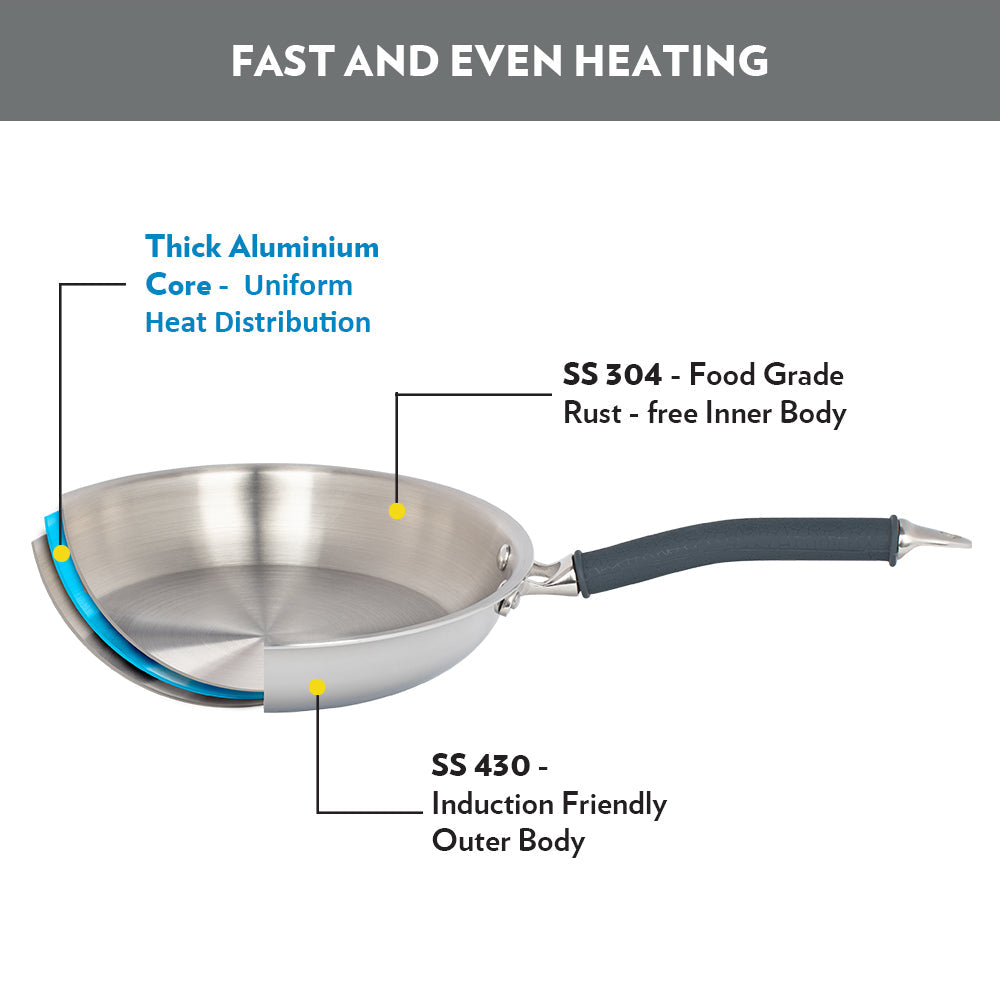 A good frying pan is an important part of any chef's (home or professional) toolkit. A durable, dependant one even more so. The Borosil stainless steel frying pan with a tri-ply body and silicone handles sure qualifies as one. It heats quickly, distributes heat evenly, saves on energy consumption and the handle stays cool to the touch preventing finger burns. Use it to rustle up scrambled eggs, omelettes and sauteed vegetables and more. The heavy gauge stainless steel will last for years without denting, and is non-toxic and non reactive even with acidic foods - ensuring your family stays both happy and healthy!