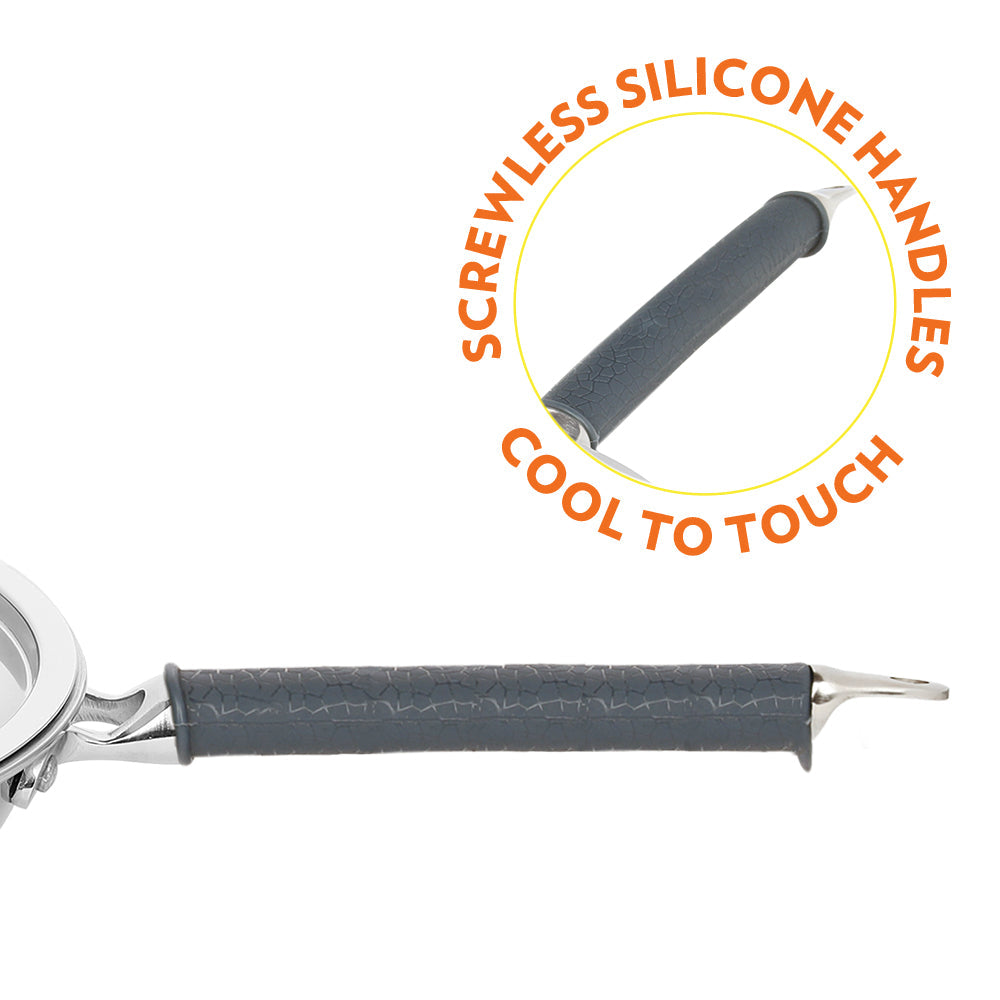 Silicone handleThe silicone handles provide a safe and comfortable grip while cooking.