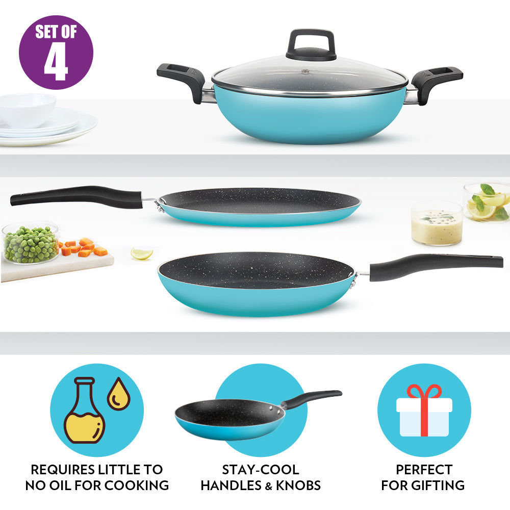 Borosil Festive Glory Cookware Set, Blue, 4 pc Set (Dosa Tawa + Deep Kadhai + Fry Pan + Glass Lid)