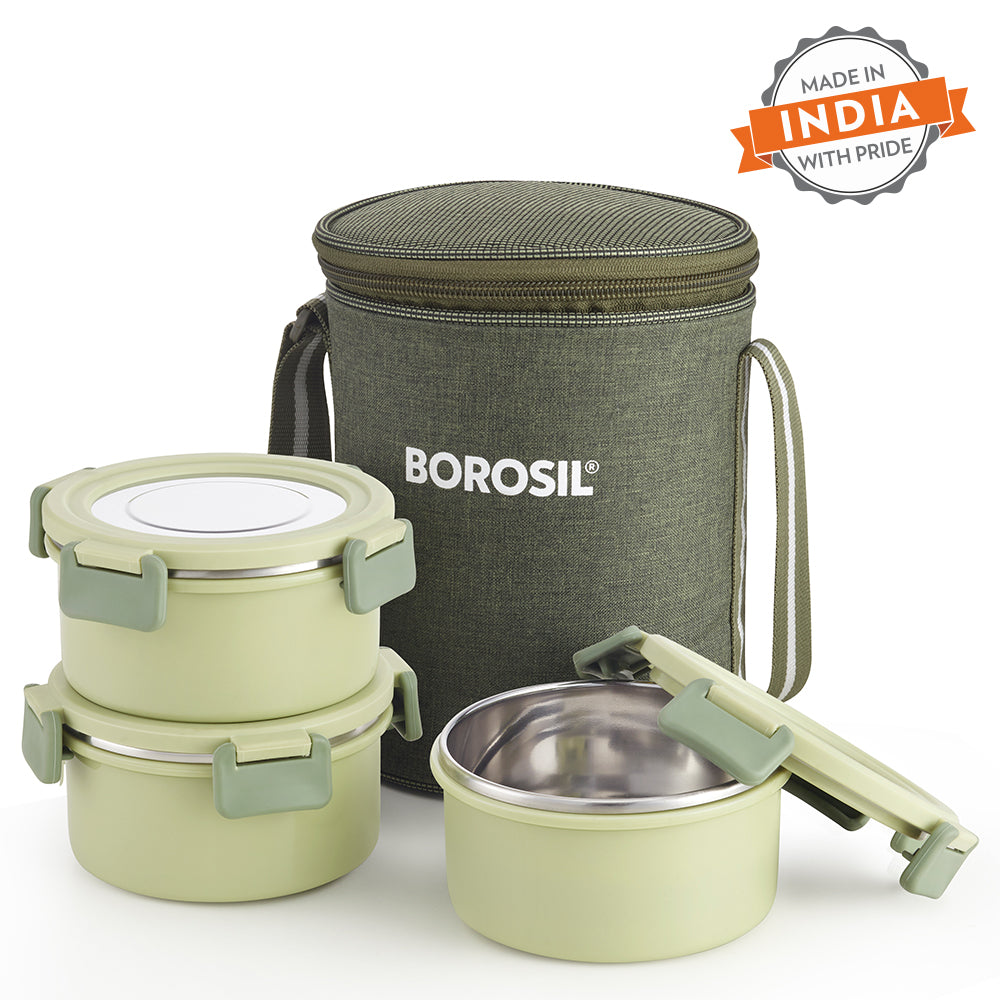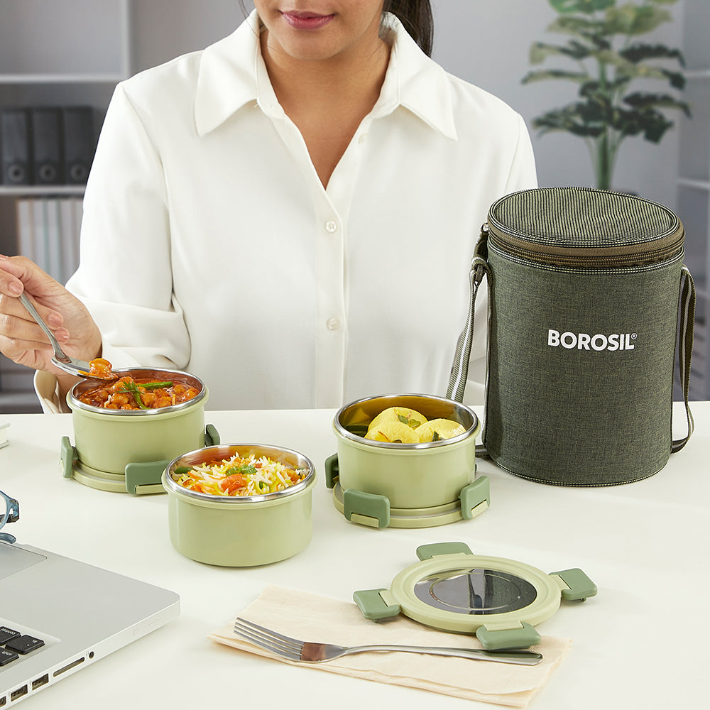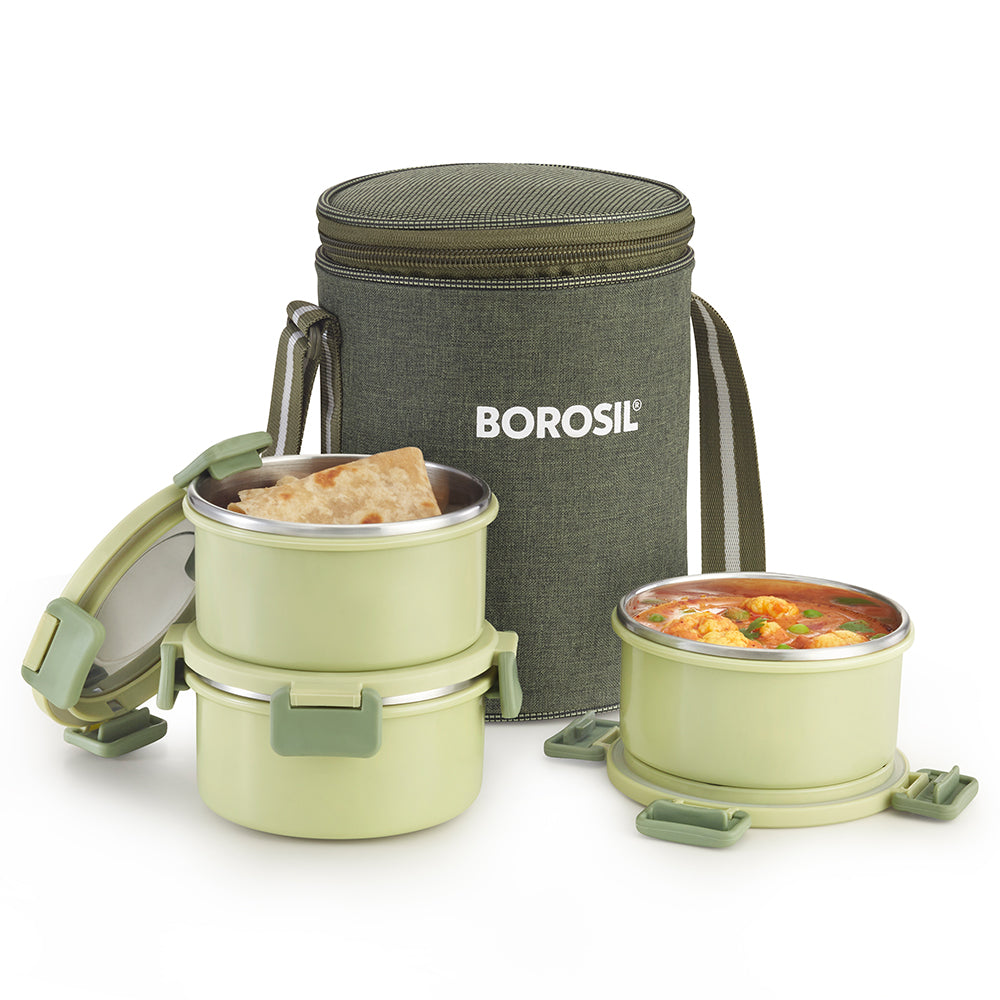 Borosil Glory Green Lunchbox, Set of 3, Tall