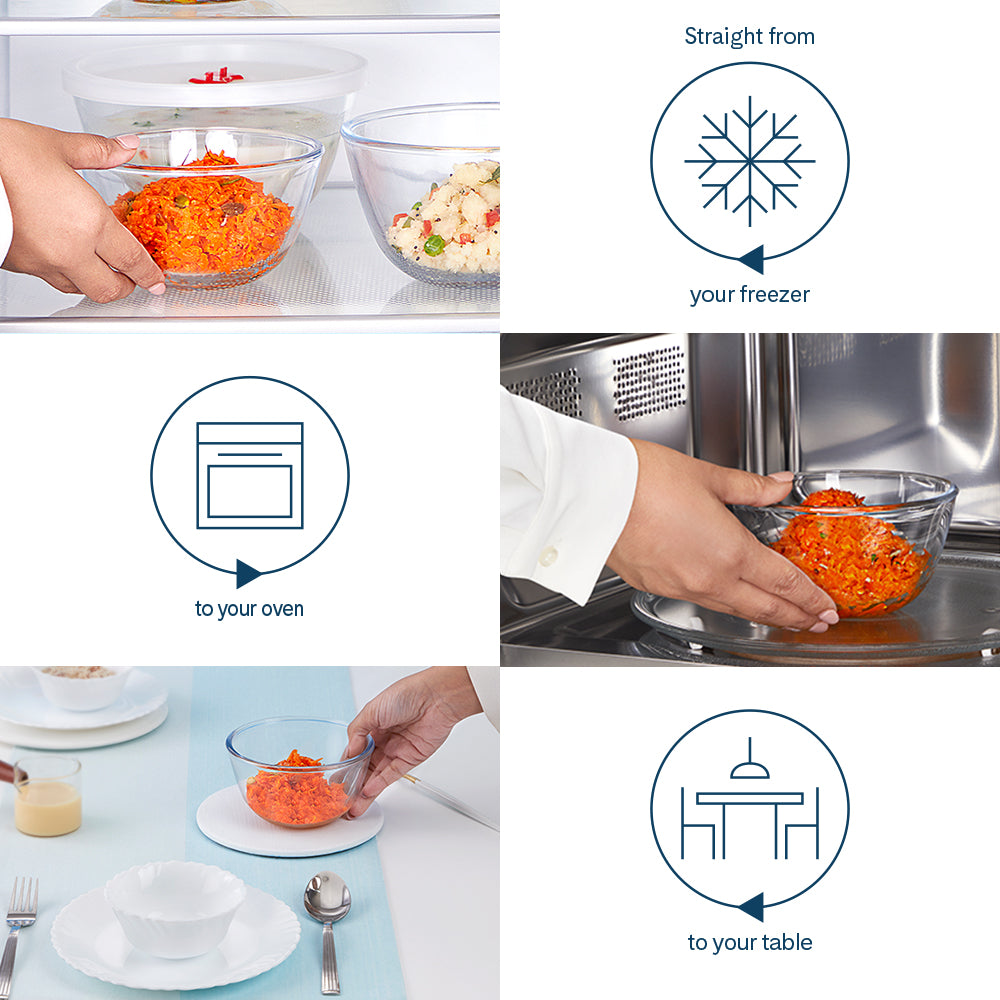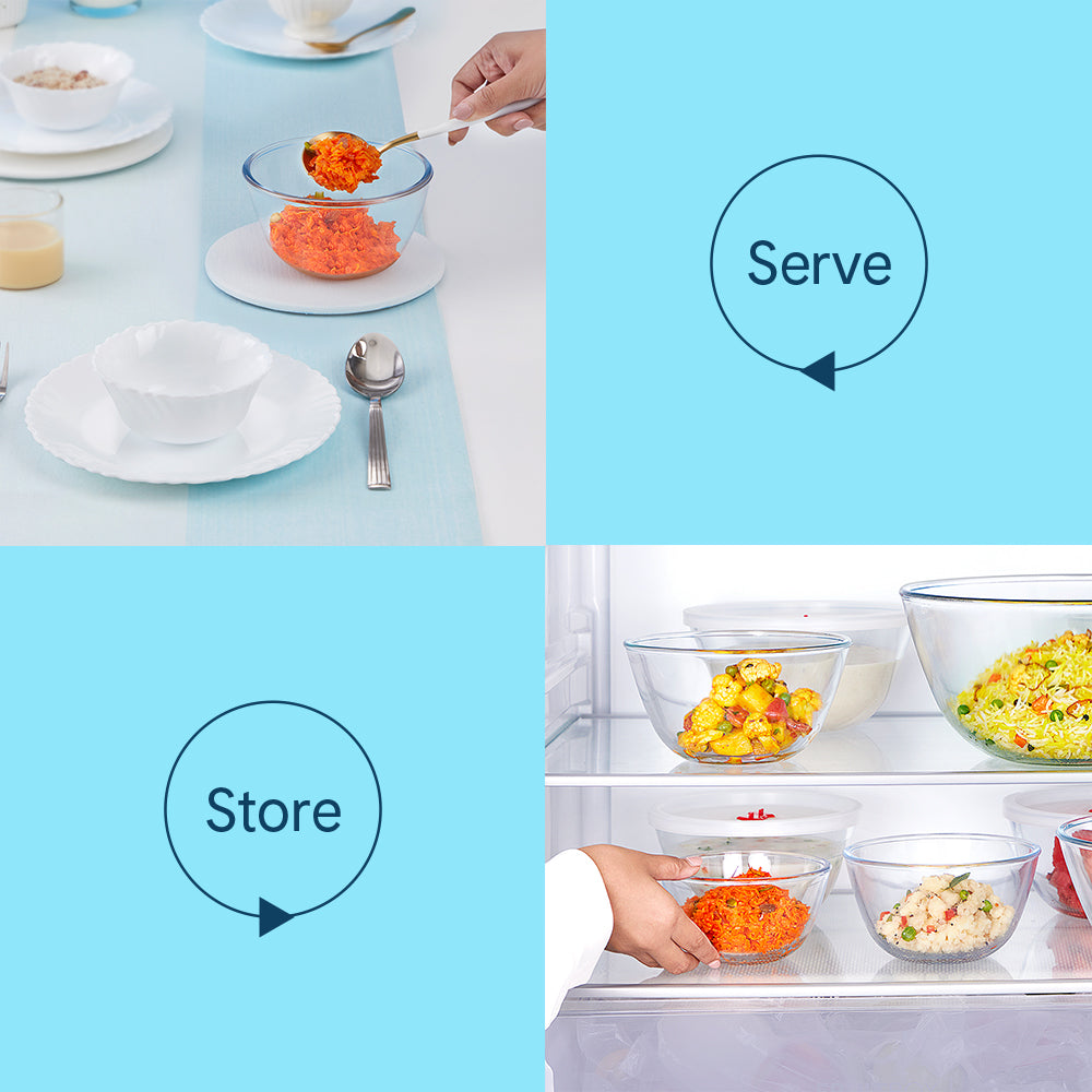 If you're looking for the perfect bowls for your everyday meals, the Larah Everyday Glass Bowls are just ideal. They're super durable and just right for serving dal, sabzis, and curries. Plus, they're microwave- safe and easy to handle, so you'll love using them everyday for all meals.