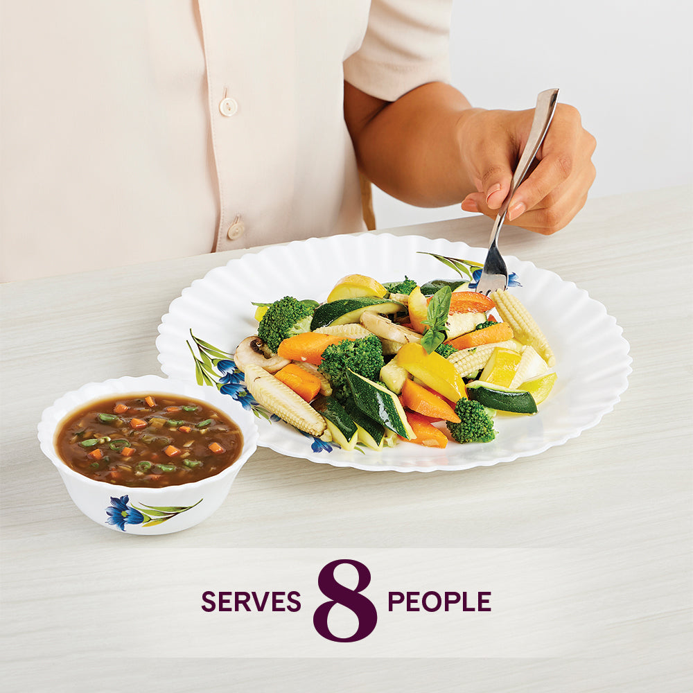- Included Components: 8 Full Plates, 8 Quarter Plates, 8 Veg Bowls, 8 Soup Bowls, 8 Spoons, 1 Rice Plate, 3 Serving Bowls (8") + 3 Lids, 8 Cups (140 Ml) + 8 Saucers