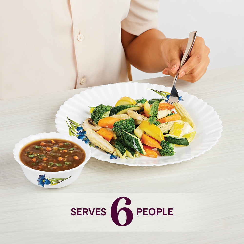 - Included Components: 6 Full Plates, 6 Quarter Plates, 12 Veg Bowls, 6 Soup Bowls, 2 Serving Bowls, 1 Rice Plate