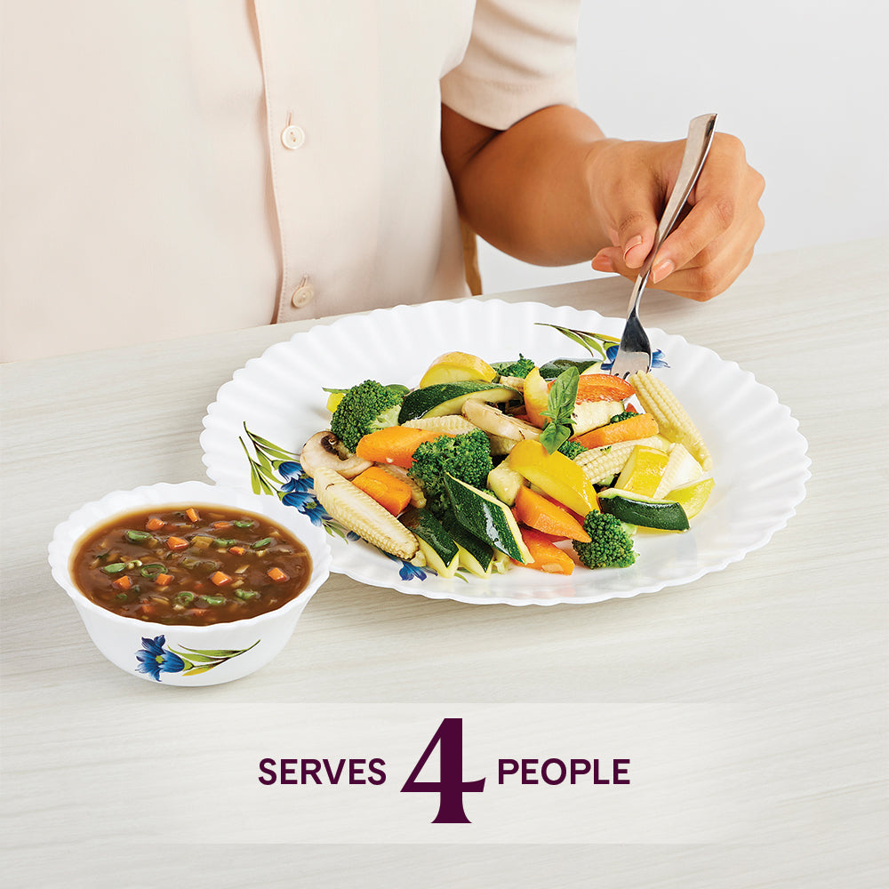 - Included Components: 4 Full Plates, 4 Quarter Plates, 4 Veg Bowls, 1 M. Serving Bowl