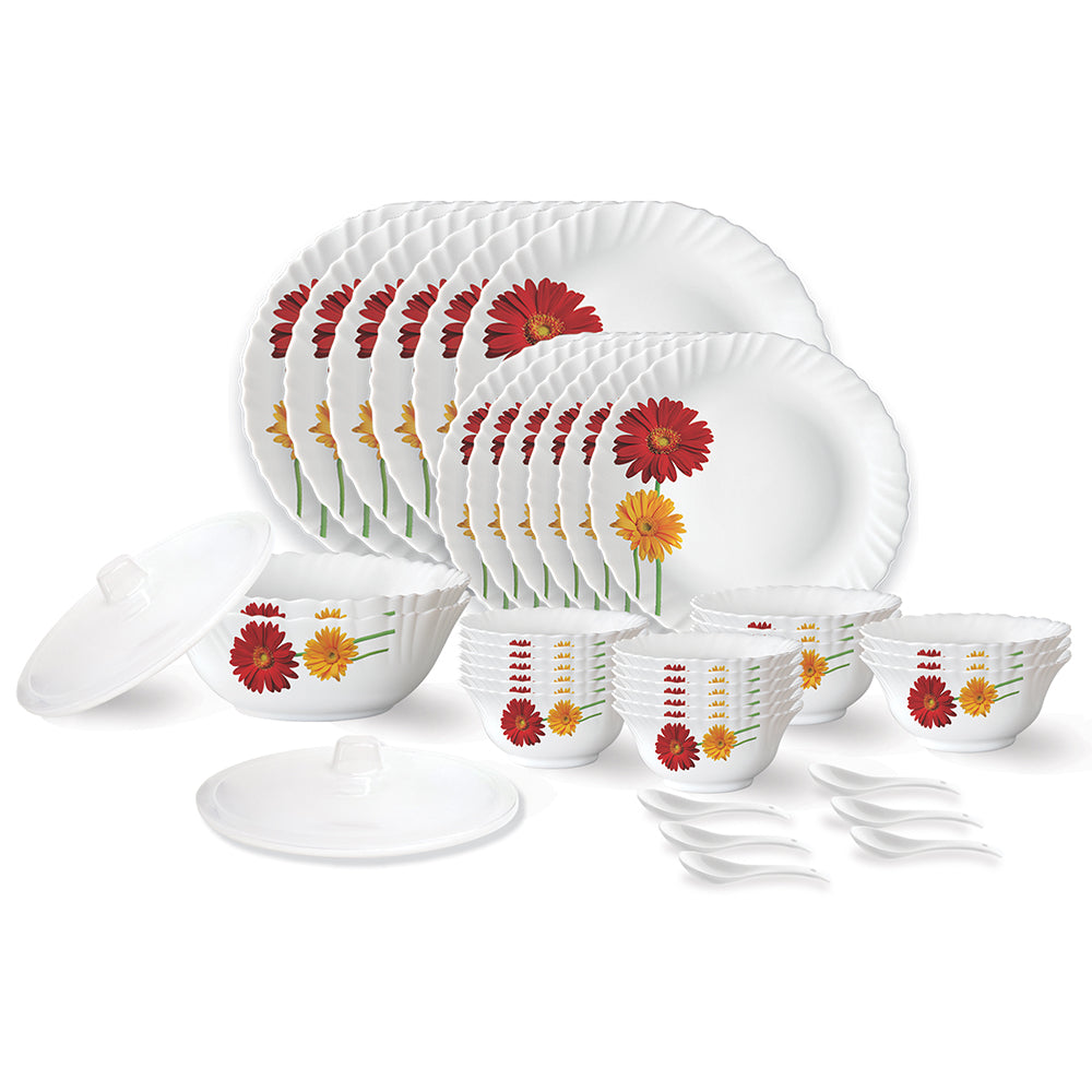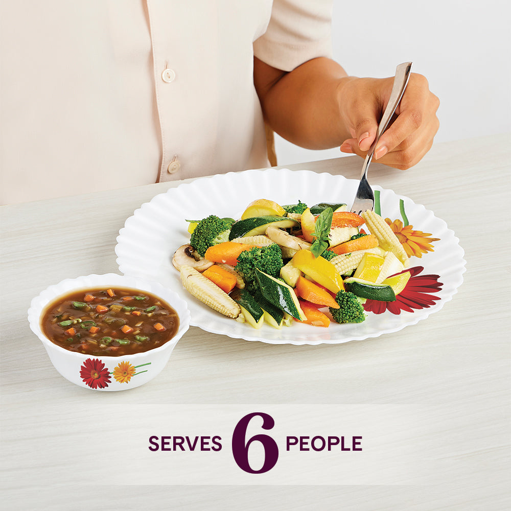 - Included Components: 6 Full Plates, 6 Quarter Plates, 6 Veg Bowls, 6 Soup Bowls, 6 Spoons, 1 Rice Plate, 2 Serving Bowls, 6 Cups (140 Ml) + 6 Saucers