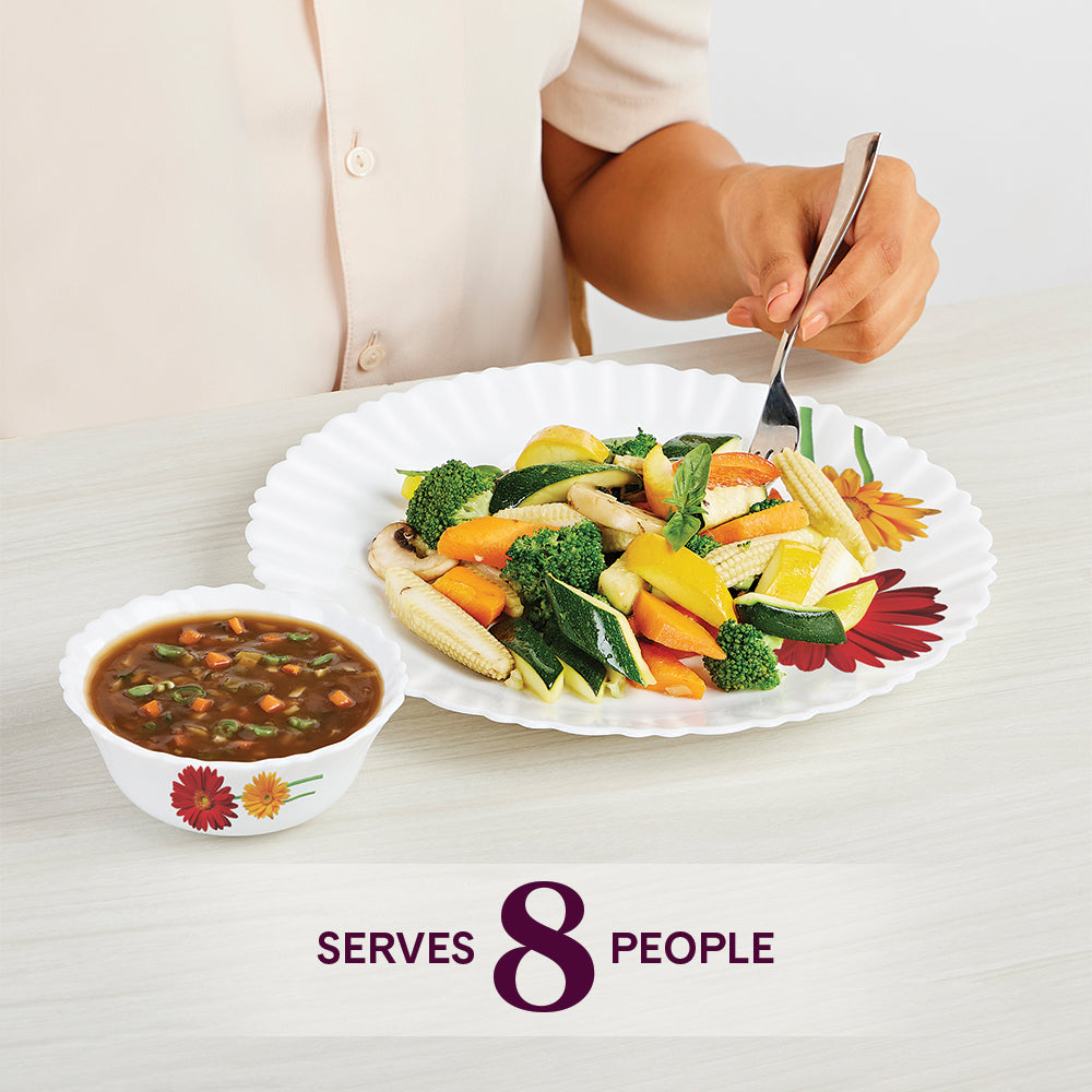 - Included Components: 8 Full Plates, 8 Quarter Plates, 8 Veg Bowls, 8 Soup Bowls, 8 Spoons, 1 Rice Plate, 3 Serving Bowls (8") + 3 Lids, 8 Cups (140 Ml) + 8 Saucers