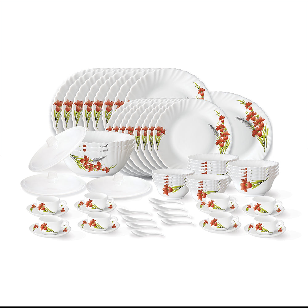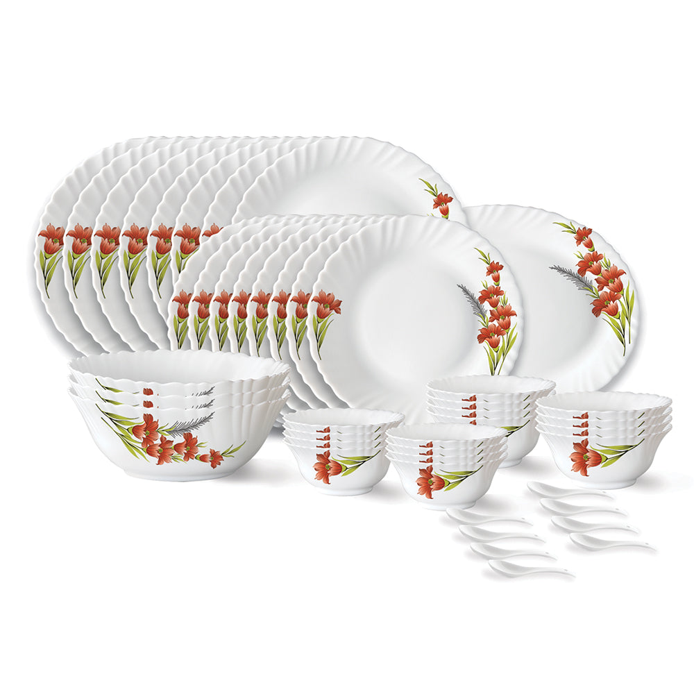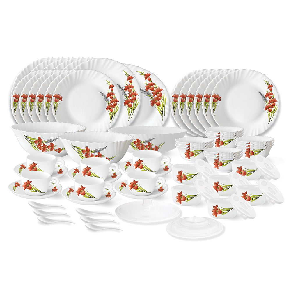 - Included Components: 6 Full Plates, 6 Quarter Plates, 6 Veg Bowls, 6 Soup Bowls, 6 Spoons, 1 Rice Plate, 1 Serving Bowl, 6 Soup Plates, 1 M. Serving Bowl (860 Ml), 1 Salad bowl (1.2 L), 6 Katori Bowls, 6 Cups (140 Ml), 6 Saucers, 8 Lids