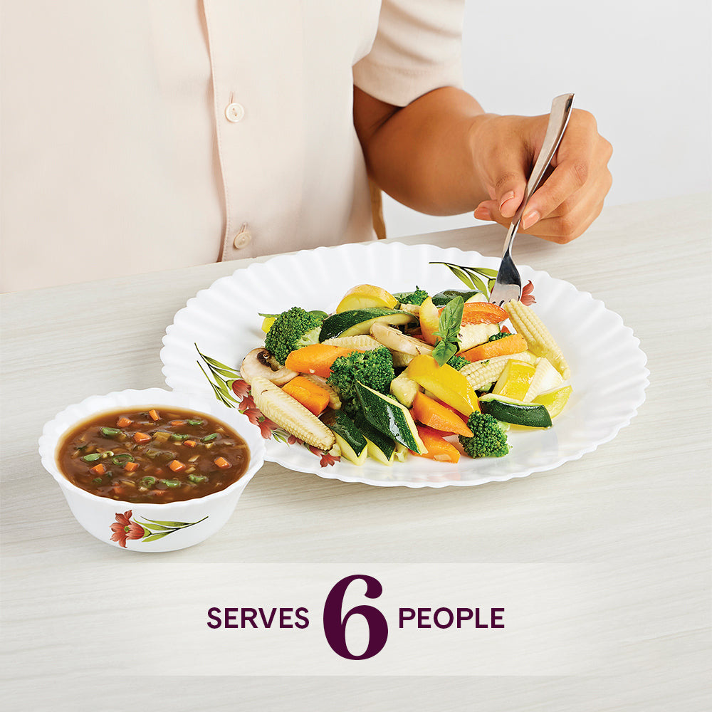 - Included Components: 6 Full Plates, 6 Quarter Plates, 6 Veg Bowls, 6 Soup Bowls, 6 Spoons, 1 Rice Plate, 2 Serving Bowls, 6 Cups (140 Ml) + 6 Saucers