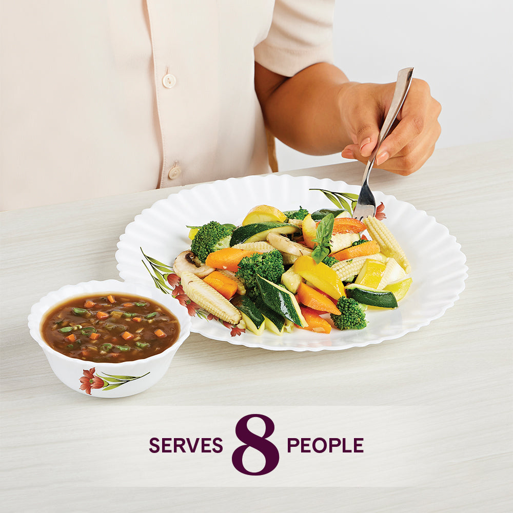 - Included Components: 8 Full Plates, 8 Quarter Plates, 8 Veg Bowls, 8 Soup Bowls, 8 Spoons, 1 Rice Plate, 3 Serving Bowls (8") + 3 Lids, 8 Cups (140 Ml) + 8 Saucers