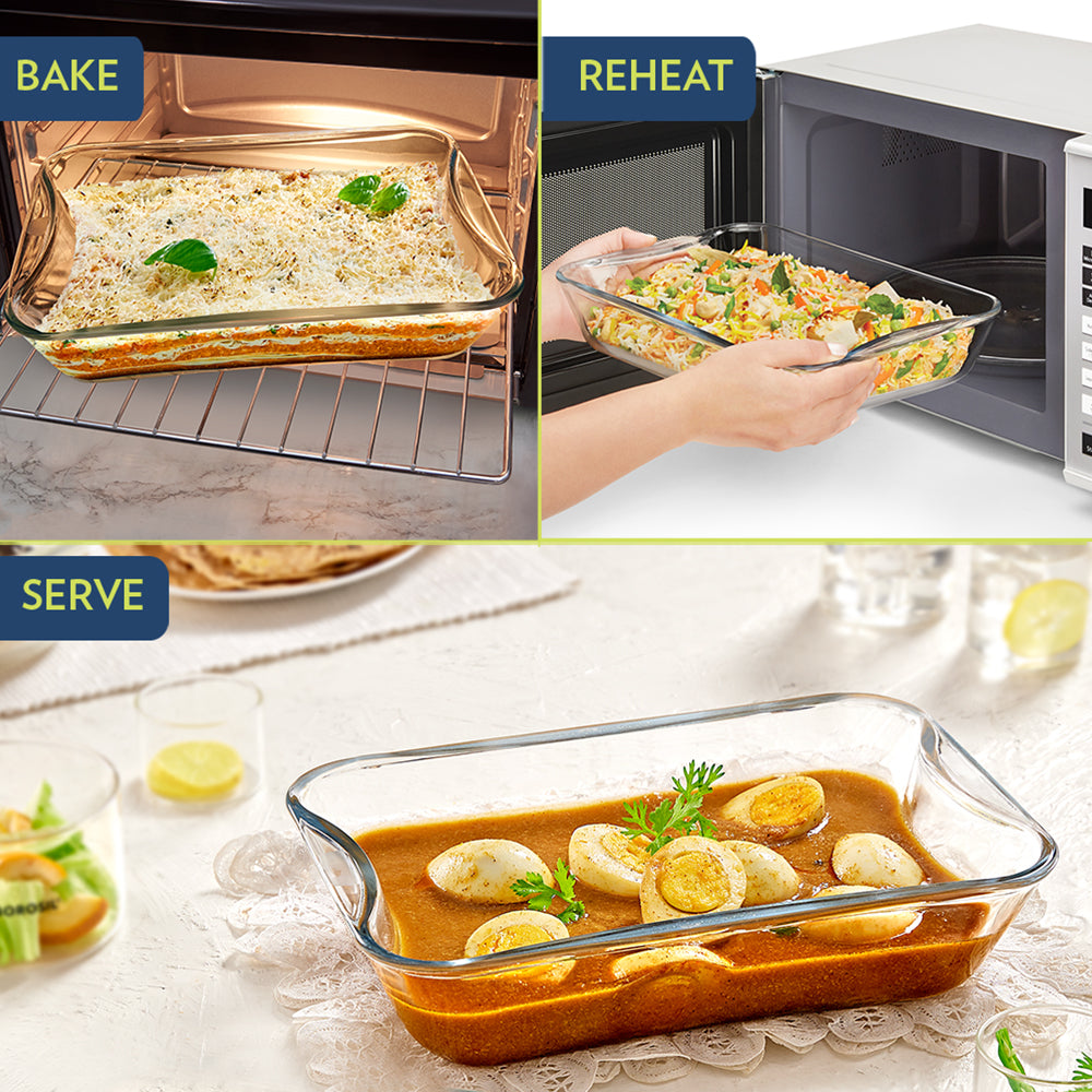 The EasyGrip Rectangular Dish is your go to when serving large portions of food such as dahi bhalla, jalebi, rasmalai and much more. This microwave and oven safe dish is your perfect serving partner for parties and get togethers - the easygrip handles make it super convenient to carry, and you can bake heat and serve in it while looking great at the same time!