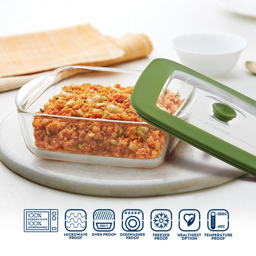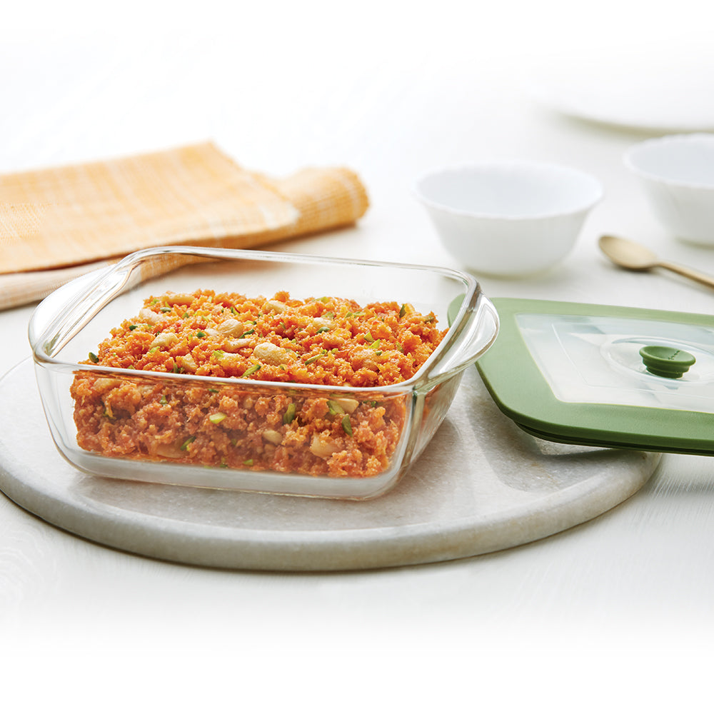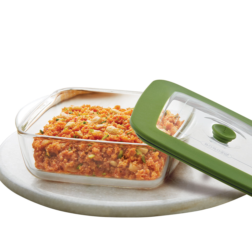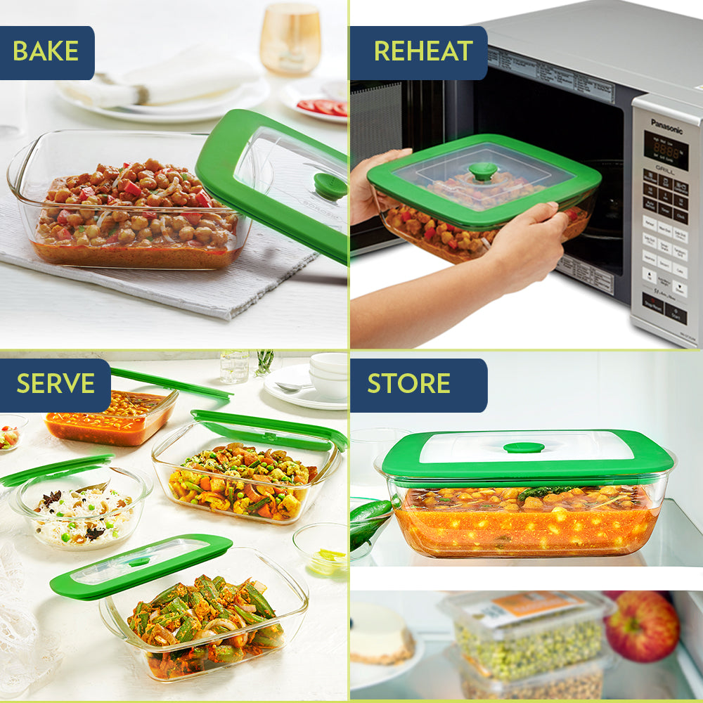 Now bake, serve, store, reheat - all in the same dish! Great for pulaos, lasagnas, pastas, macaronis, kebabs, cakes, breads - these dishes can be used to cook whatever you feel like. The special airtight seal keeps the food fresh when stored in the fridge and does not allow any smell to enter or exit. The lid can be used to reheat for up to 30 seconds in the microwave with the knob up to allow for steam release. When serving, put the knob down to ensure that the food stays hot.