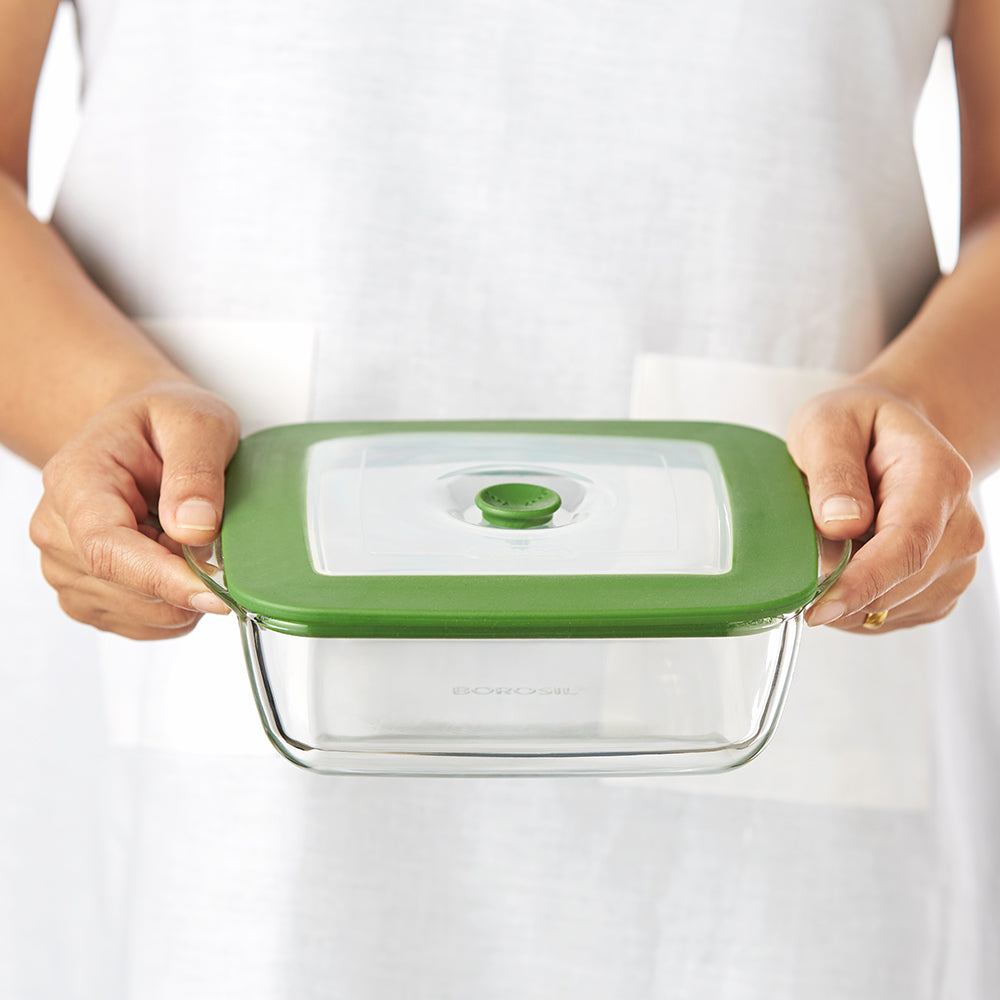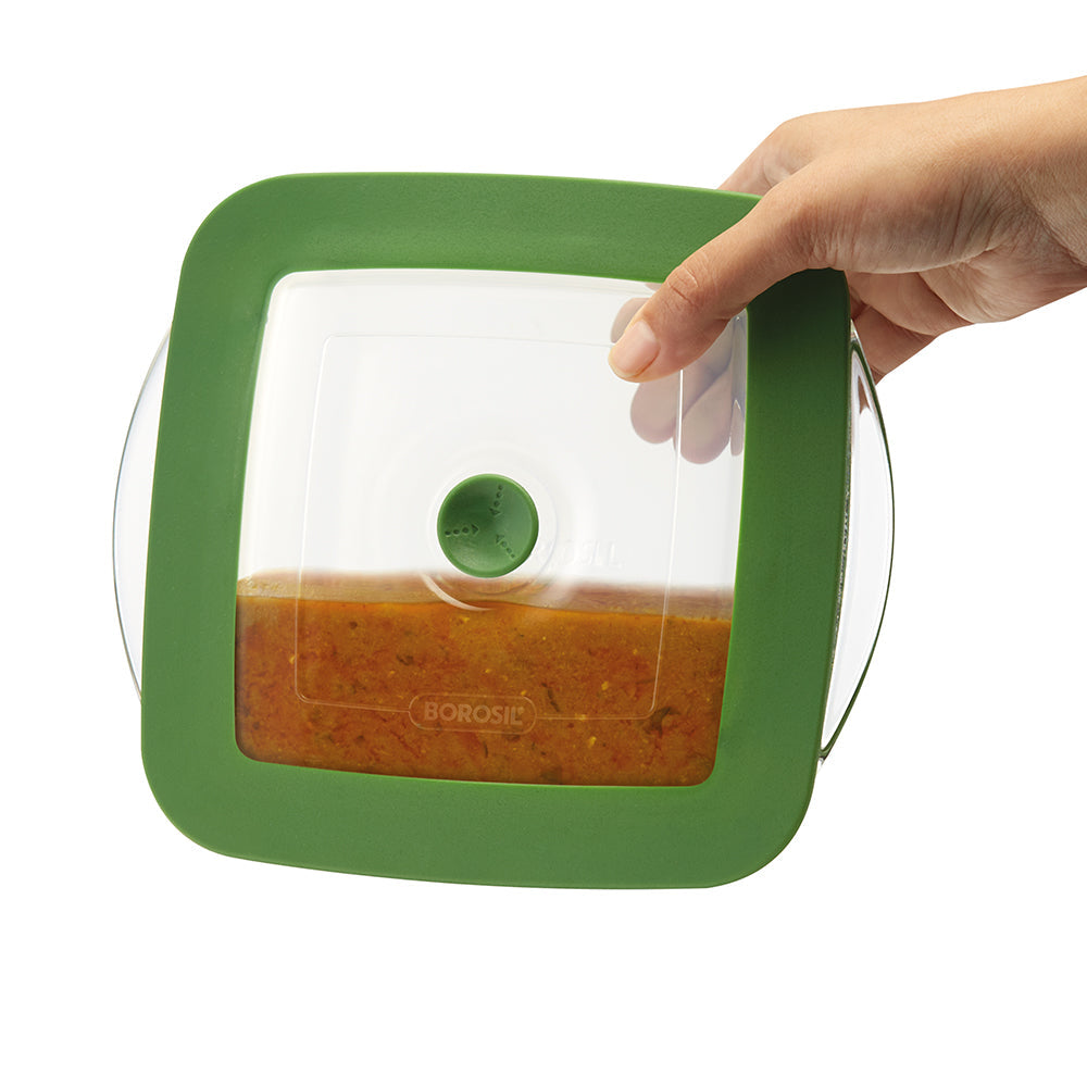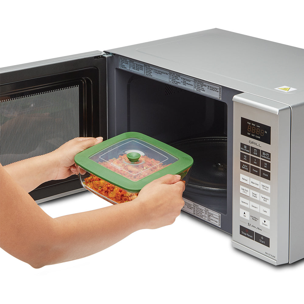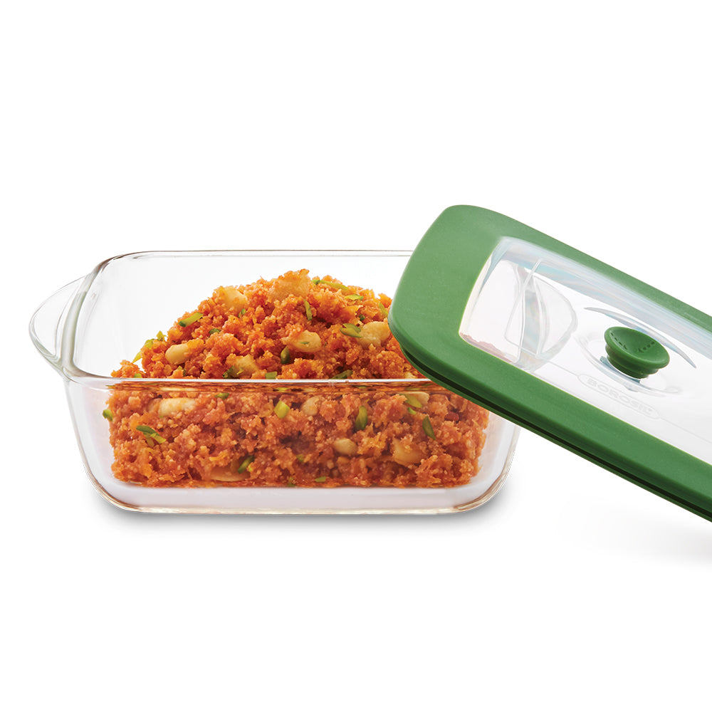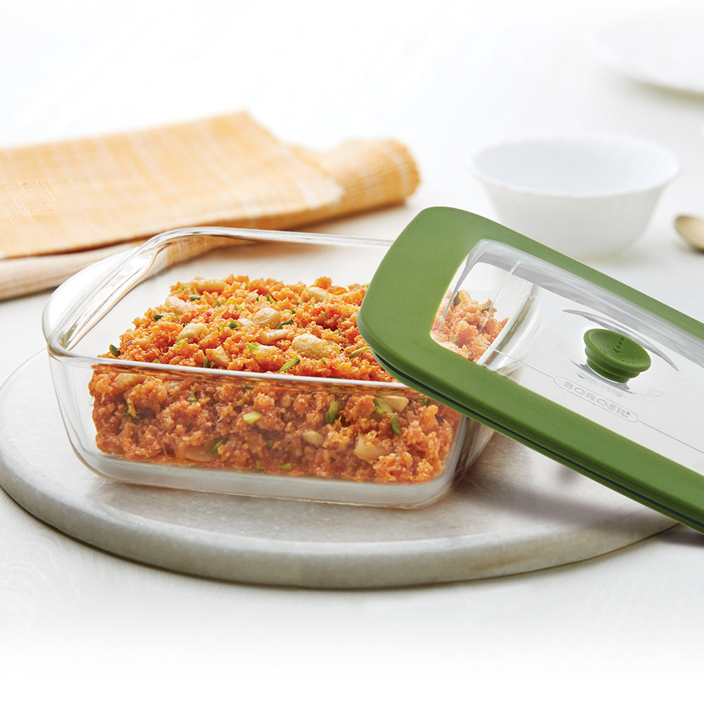 Now bake, serve, store, reheat - all in the same dish! Great for pulaos, lasagnas, pastas, macaronis, kebabs, cakes, breads - these dishes can be used to cook whatever you feel like. The special airtight seal keeps the food fresh when stored in the fridge and does not allow any smell to enter or exit. The lid can be used to reheat for up to 30 seconds in the microwave with the knob up to allow for steam release. When serving, put the knob down to ensure that the food stays hot.